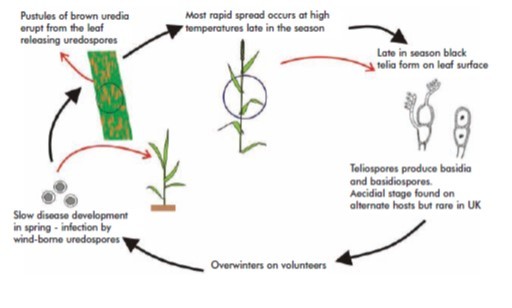 Brown rust (Puccinia triticina) is a foliar pathogen of wheat and initiates disease by many cycles of airborne uredospores, particularly in the spring. It is favoured by warmer conditions compared to yellow rust and tends to develop later in the summer than yellow rust, during warm, humid spells of weather.
